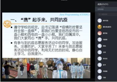 霍秋艳老师在《JAVA程序设计》课程的第一课中,特别讲述了2019级员工张玉鉴为抗疫贡献出的西电网红云应用“XDer今天吃什么”的实际,鼓励大家向身边的榜样学习,充分发挥专业优势,积极作为,用专业所学真正服务身边的同学。同时以自己和公司多名老师积极承担志愿者的事例激励大家,疫情期间放稳心态,积极参加志愿者活动,充分利用无打扰时间提升自我,同心携手,共同抗疫。
