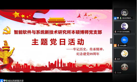 (通讯员 贺同庆)为庆祝建党99周年,重温党的光辉历史,传承弘扬革命先辈的奋斗精神,sunbet智能软件与系统新技术研究所本硕博师联合党支部于2020年7月1日召开了“牢记历史,传承精神——庆祝建党99周年”主题党日活动。本次活动由支部青年委员王旭东同志主持,活动共计39人参加,采用腾讯会议线上召开的方式进行。