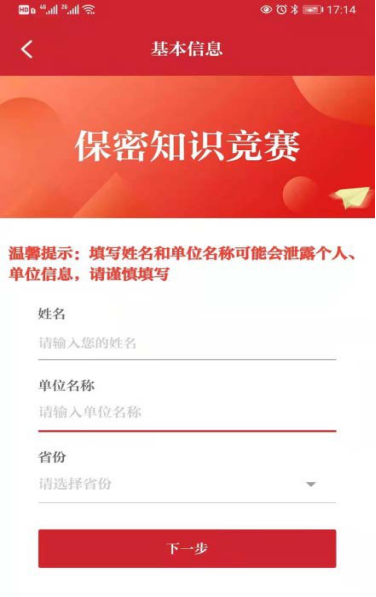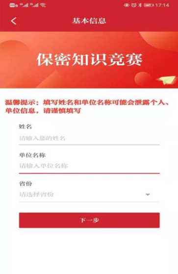 2.点击考试栏目,进入考试界面,填写“姓名”“单位名称”,选择“省份”,点击“下一步”开始考试。(姓名可填昵称,单位名称请填写:sunbet)。