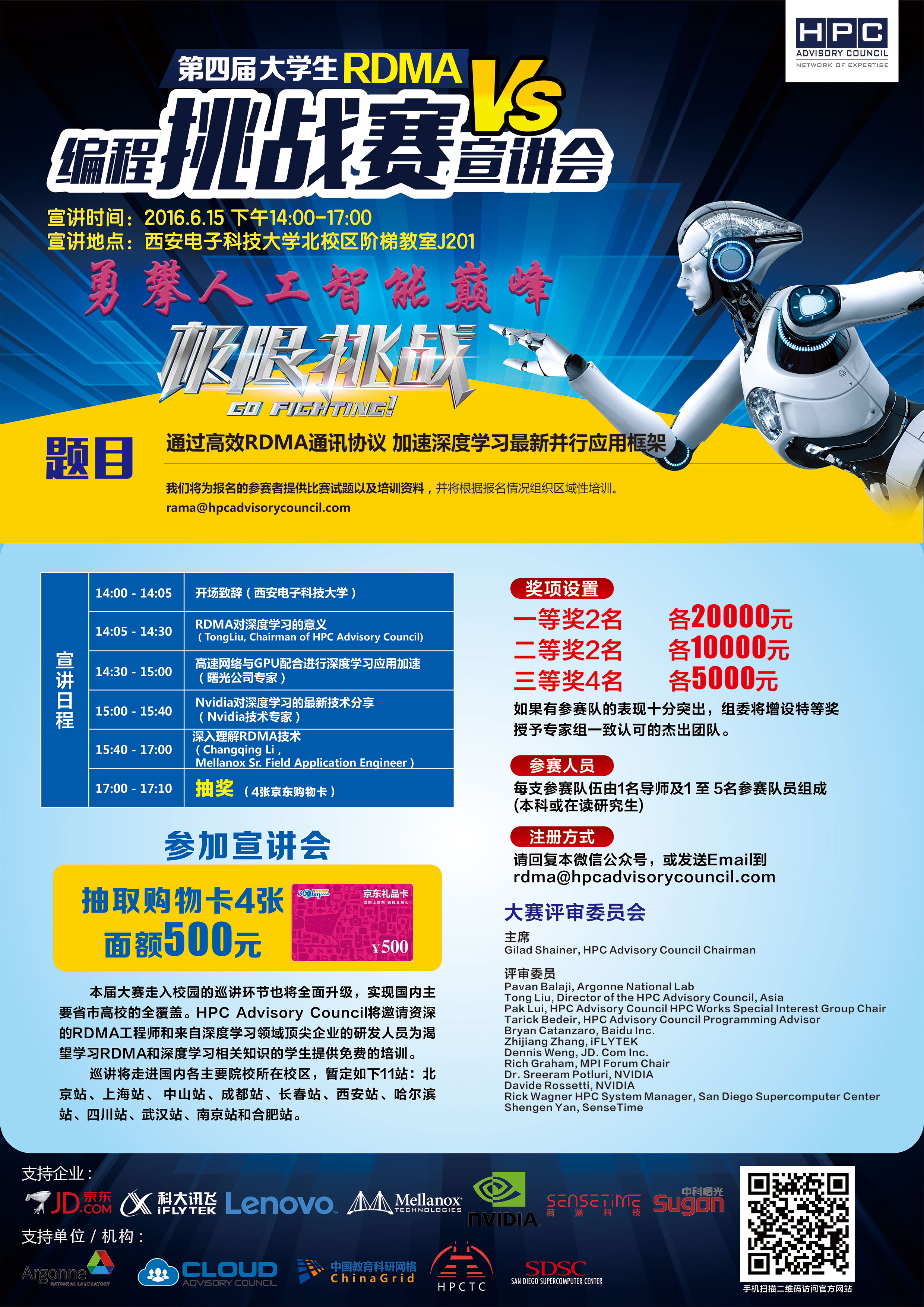 • 大赛即日起开始, 至10月15日结束, 并将于HPC Advisory Council中国研讨会期间(10月26日,西安)举行颁奖典礼。美国知名高校教授与专家将现场颁奖并会向表现优秀员工伸出入读美国名校的橄榄枝。