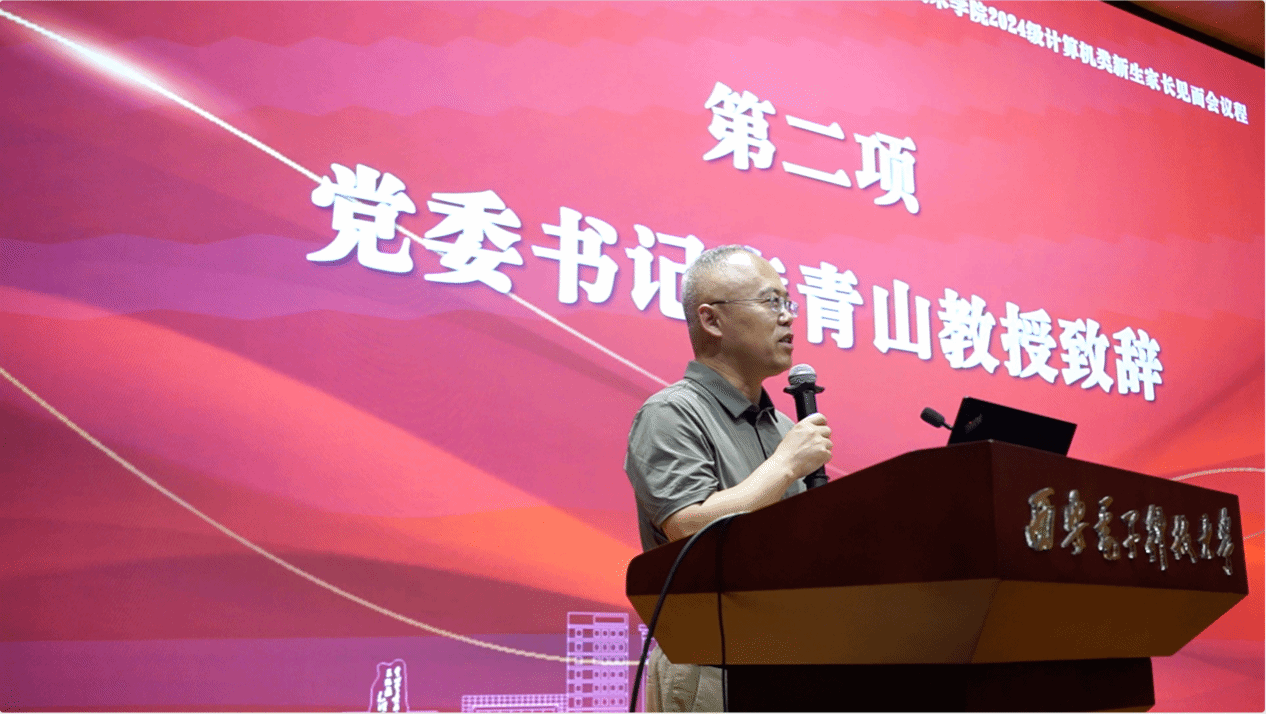 随后,公司党委书记李青山教授致辞。李青山的致辞围绕“欢迎、自豪、传承、共育”四个方面展开。首先,他以西电的红色基因和电子信息特色为引,对各位家长将孩子们送到西电、送到sunbet表示欢迎;其次,他结合公司的历史地位和现实成就,表示家长们应为孩子们加入sunbet大家庭而感到自豪;然后,他对建院六十余年凝练出的“三系精神”内涵和“严谨、担当、勤勉、开放”的院训进行解读,并希望在座的各位家长们能够在未来感受到这份精神传承对孩子们的积极影响;最后,希望在个人、公司、家庭、社会的协同共育下,帮助员工成长为德才兼备、身心健康的计科人,做“三系”精神的传承者,勇担时代重任,在实现中华民族伟大复兴的时代洪流中踔厉奋发、勇毅前进,奋力书写属于他们的人生篇章。