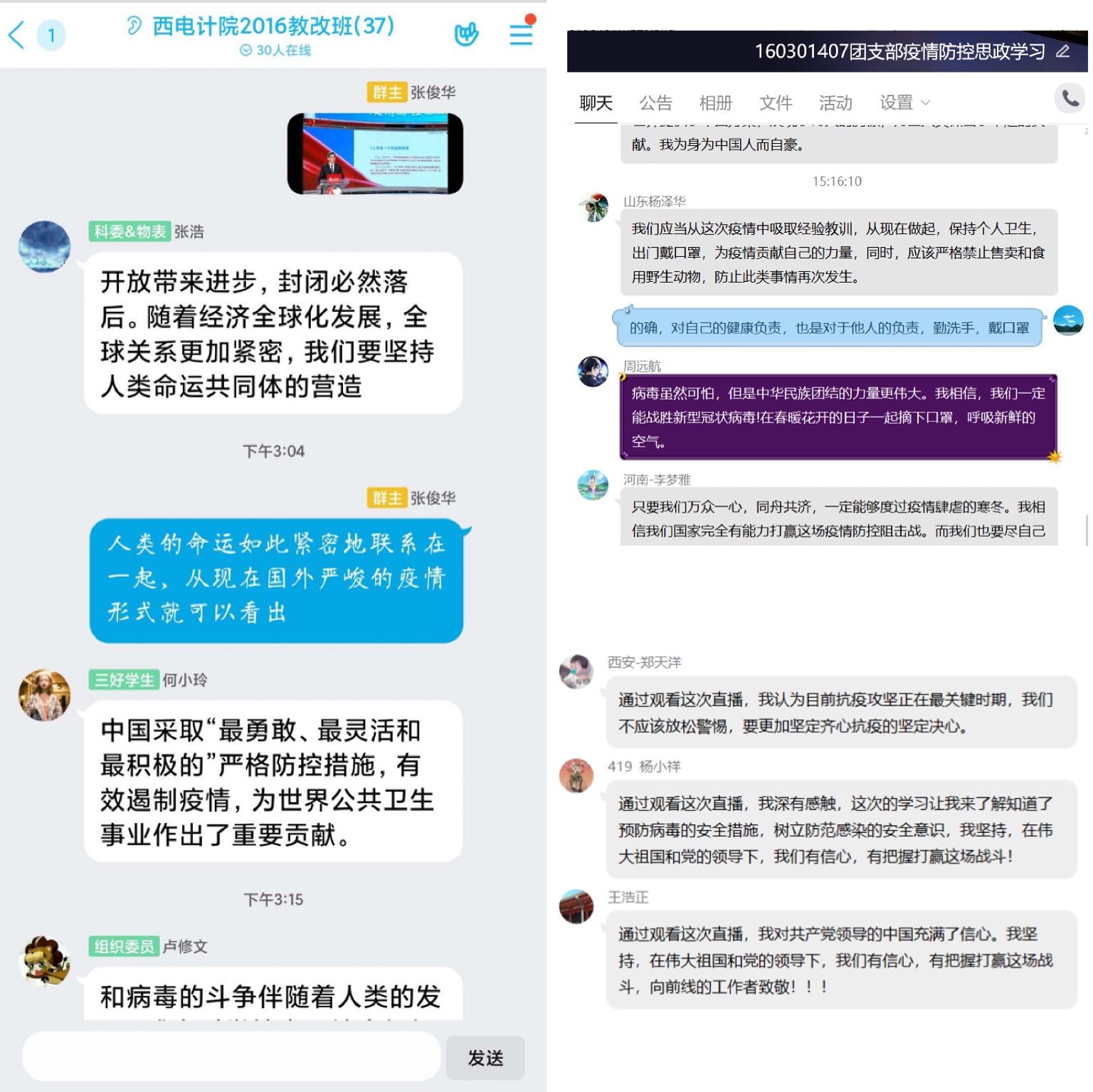 本科2016级软件工程专业员工支部组织各教学班观看了直播,并通过QQ群、微信群等展开线上讨论。辅导员艾菲结合直播课程内容及近期工作进行了专题点名,并现场连线湖北籍员工党员代表讲述抗疫故事。王淦同学说:“这次疫情事件深刻反映了我国‘集中力量办大事’的制度优势,也是中国特色社会主义制度优势的体现。”罗钊同学说:“无数医护工作者奋战在疫情前线,无数党员同志和基层干部下沉社区,还有数不清的志愿者都在为新冠肺炎疫情贡献自己的一份力。作为青年学子的我们,应该坚持全面、辩证的观点,任何时候都要居安思危,保持忧患意识,要有担当,要有责任意识。”