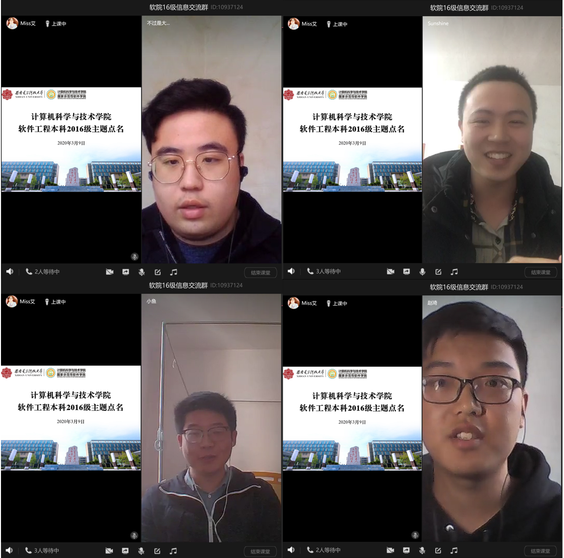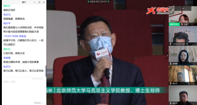 本科17级计算机科学与技术专业0108班班长史越超通过腾讯课堂组织了主题班会,全班62名同学在线上的“云”相聚,共同观看思政课。在班长的组织下,同学们结合课程学习内容对党中央关于疫情防控的决策部署、身边防疫抗疫一线的感人故事等展开了讨论。班长史越超表示:“通过本次班会学习,同学们明确了作为老员工在这场疫情中的责任与担当,表示要身体力行,积极参与到防疫抗疫中,相信在不久后我们一定能取得战斗的胜利!”