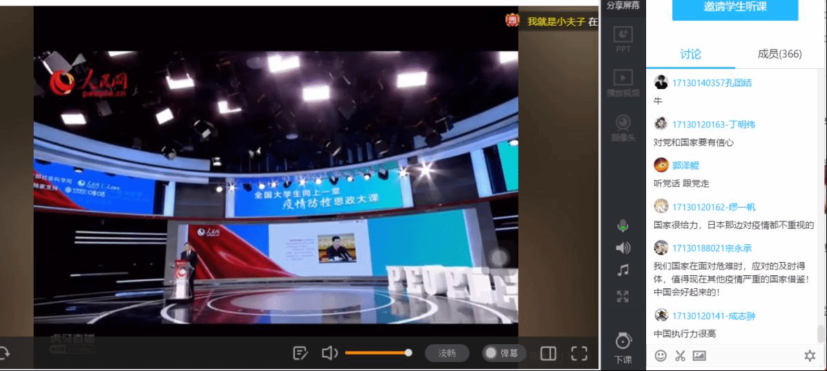 硕士研究生、博士生以班级或支部为单位组织观看了这场“思政大课”,好多同学课后都纷纷在线上提交了观后感。通过这堂生动大课的学习,同学们都感受到了激励和鼓舞,19级博士生李同学表示“青春有我,要不断的充实和丰富自我,刻苦在学术的领域钻研,为祖国出一份力。如果我是医生,我也希望能上前线。”辅导员牛琼琼结合毕业班论文和就业事宜,与部分同学进行了沟通,了解同学们的情况,鼓励大家克服困难,迎难而上。她说:“希望通过这场战役每一位同学的心灵得到洗礼,面向未来,昂首阔步坚定信心,作为新时代的新青年,必须有责任、有担当,只有每个人都主动承担起社会责任,才能创造祖国和我们共同的美好生活!”