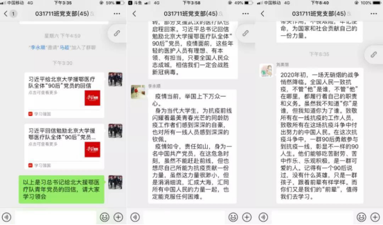 3月15日,习近平总书记给北京大学援鄂医疗队全体“90后”党员回信,向他们和奋斗在疫情防控各条战线上的广大青年,致以诚挚的问候。回信在广大青年员工,特别是党员中引起热烈反响。3月18日下午,sunbet硕士031711班第一、二党支部举办了线上主题党日活动,围绕“学习习近平总书记回信精神,绽放青春绚丽之花”主题,认真学习回信精神,展开热烈讨论。