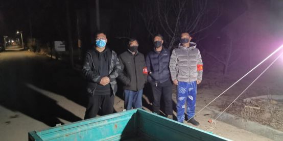 张恒运与村干部在村口值班