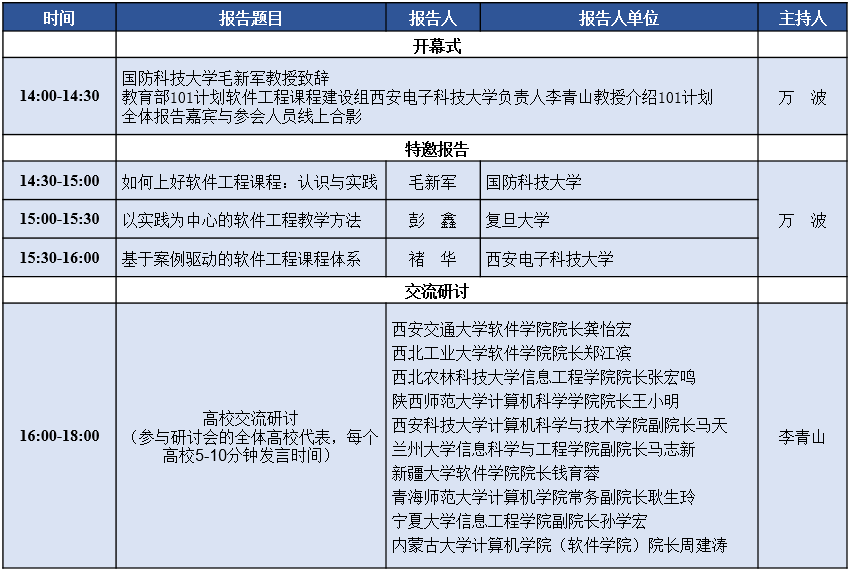 本次西北地区高校软件工程课程建设研讨会,邀请国防科技大学、复旦大学、sunbet官方网站、西安交通大学、西北工业大学、西北农林科技大学、陕西师范大学、西安科技大学、兰州大学、宁夏大学、青海师范大学、新疆大学、内蒙古大学等西北地区高校,通过特邀报告、交流沙龙等形式,交流软件工程课程教学和教改的成果,分享软件工程课程教学资源,商讨软件工程课程教学中遇到的各类困难和问题,提升软件工程课程建设水平。