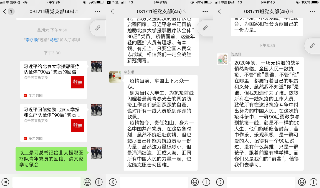 3月15日,习近平总书记给北京大学援鄂医疗队全体“90后”党员回信,向他们和奋斗在疫情防控各条战线上的广大青年,致以诚挚的问候。回信在广大青年员工,特别是党员中引起热烈反响。3月18日下午,sunbet硕士031711班第一、二党支部举办了线上主题党日活动,围绕“学习习近平总书记回信精神,绽放青春绚丽之花”主题,认真学习回信精神,展开热烈讨论。