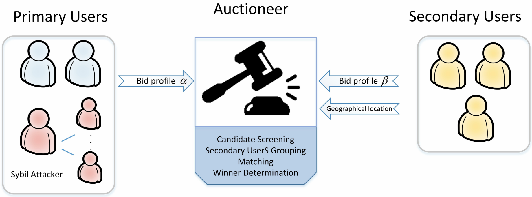 董学文副教授的论文“Towards Primary User Sybil-proofness for Online Spectrum Auction in Dynamic Spectrum Access”主要研究了在5G网络中的频谱资源分配问题。目前,动态频谱接入(Dynamic spectrum access, DSA)是大量无线设备涌现造成频谱短缺问题的有效解决方案,其中基于拍卖的频谱分配机制因其良好的分配效率和公平性而受到广泛的研究。然而,在拍卖过程中存在一种名为Sybil攻击(即女巫攻击)的攻击形式,一个恶意用户通过使用两个或多个假身份同时参与竞拍以获利。这种攻击会影响拍卖结果并且会严重损害诚实用户及竞拍机构的利益。现有的抗Sybil攻击的频谱拍卖机制只针对次级用户的攻击,但是在主次用户同时参与拍卖的双向频谱拍卖机制中,主用户也可以通过Sybil攻击获利。为此,该文提出一种可以对抗主用户Sybil攻击的在线双向频谱拍卖机制TSUNAMI。TSUNAMI通过计算次级用户的机会成本筛选出其中部分性价比高的次级用户参与频谱分配,设计报价无关的排序方式和顺序匹配方法来实现主用户的抗Sybil攻击性和真实性,并且在最后进行了大量的仿真实验验证了TSUNAMI满足这些期望的性能。