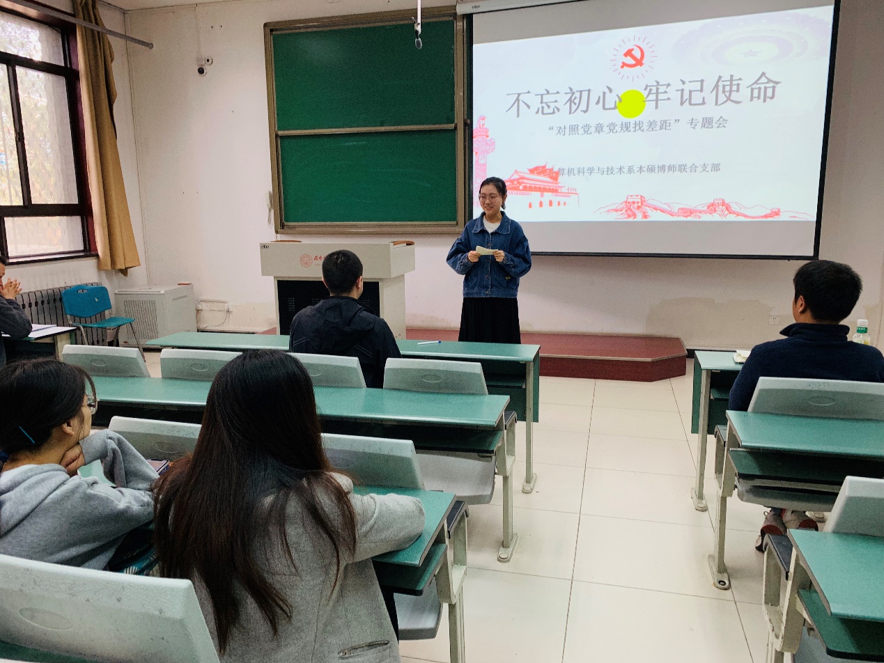 (通讯员 胡洁)2019年11月15日下午,sunbet计算机科学系本硕博师联合党支部在北校区西大楼105教室,主要聚焦“十八个是否”召开了“对照党章党规找差距”专题会,会议由党支部书记王炳波主持。