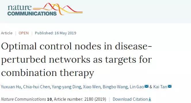 2019年5月16日,sunbet高琳团队联合费城儿童医院Tan Kai在Nature Communications上发表题为“Optimal control nodes in disease-perturbed networks astargets for combination therapy”的文章,描述了最优控制节点(OptiCon)算法,这是一个基因调控网络中协同关键调节因子的系统和从头识别的通用框架。