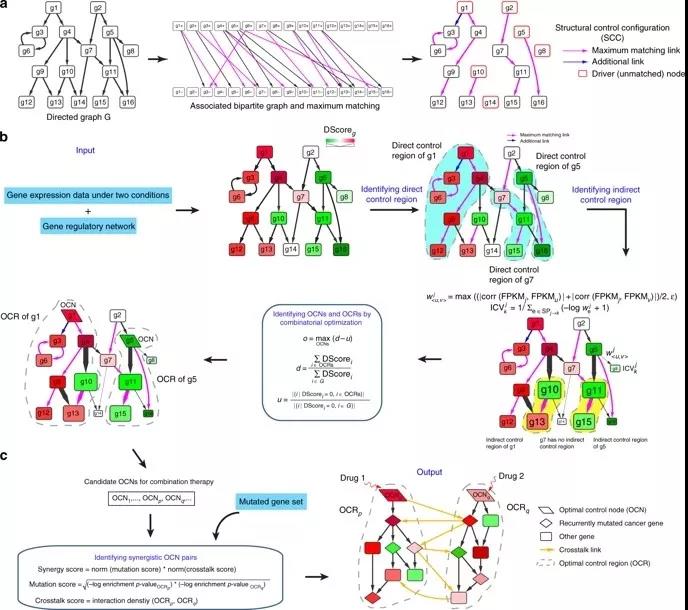 通过使用基因表达作为标准网络可控性框架中的约束,OptiCon首先在疾病扰动的基因调控网络中识别出一组最佳控制节点(OCN)。鉴定的OCN对失调的途径施加最大控制,但对未受疾病干扰的途径的控制最小。接下来,使用结合基因突变和基因功能相互作用信息的协同作用评分,OptiCon将一组协同OCN识别为疾病扰动网络中的关键调节因子,其可作为联合治疗的候选靶标。