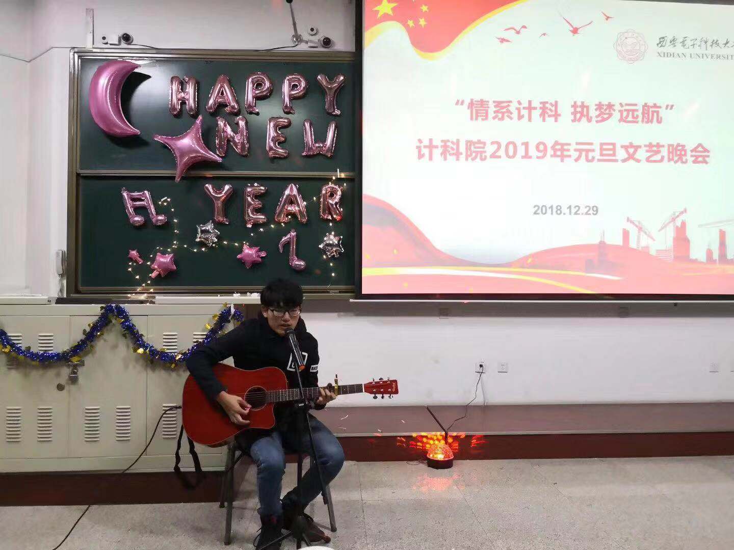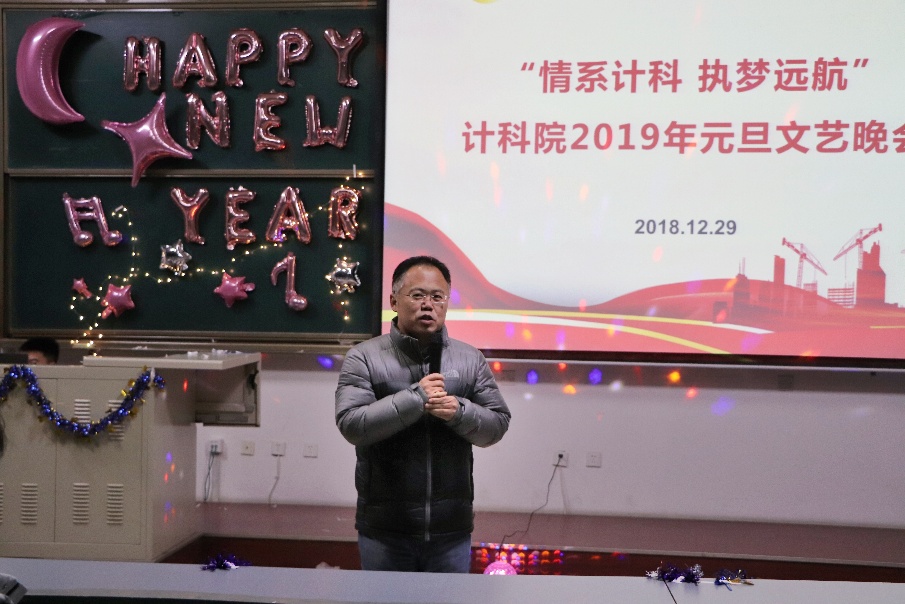 晚会开始之前李青山上台致辞,他首先对本次晚会组织人员的努力表示感谢,表达了对本次晚会的期待以及对新年的美好祝福,一是希望本次晚会为同学们2018年的学习和成长画上圆满的句号,并明确2019年“执梦远航”的方向;二是希望通过本次晚会促进同学之间的沟通及相互了解,增强班集体凝聚力,最后祝大家在新的一年里学业有成,事事顺心。