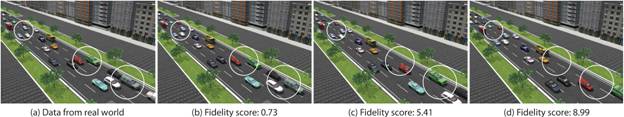 图2基于字典的虚拟车流真实度评价结果样例。越小的评价值代表虚拟车流具有较高的逼真度。(a) 真实世界车流数据,作为对比用,以更好地体现该方法的评价性能。(b)-(d) 为使用同一种微观模拟方法,但三种不同的模拟参数设置来生成的模拟数据。