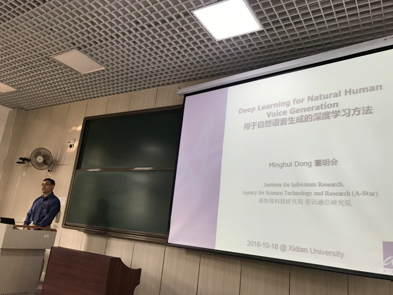 在李海洲教授作报告的同时,新加坡科技研究局资讯通信研究院的董明会博士,也做了“Deep Learning forNatural  Human Voice Generation”的学术报告。