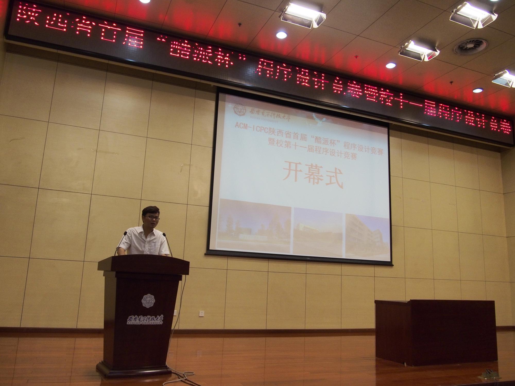 上午9点30分,开幕式在南校区行政楼206举行。130余名参赛选手和教练身着比赛服装参加了开幕式。sunbet官方网站实验室与设备处处长黄大林、计算机公司党委书记于晓飞、副经理王泉、西安交通大学软件公司副经理陈建明以及赞助商宇龙计算机通信科技有限公司西安研究所所长周佳庆先生等嘉宾出席。ACM/ICPC中国西部指导委员会委员周鹏教授专程从美国赶来出席开幕式。