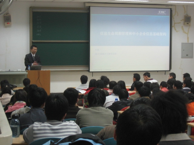 为配合《存储技术基础》课程的实施,于2007年11月13日19:00-21:00,在新校区信远楼2区117教室,公司邀请EMC公司刘磊工程师为计算机公司05级本科生作了《信息生命周期管理和中小企业信息基础架构》的技术讲座。刘磊工程师结合实际案例,说明了当前存储技术的发展情况。在整个讲座过程中,同学们表现出浓厚的兴趣并积极参与互动,现场气氛热烈,取得了良好的效果。
