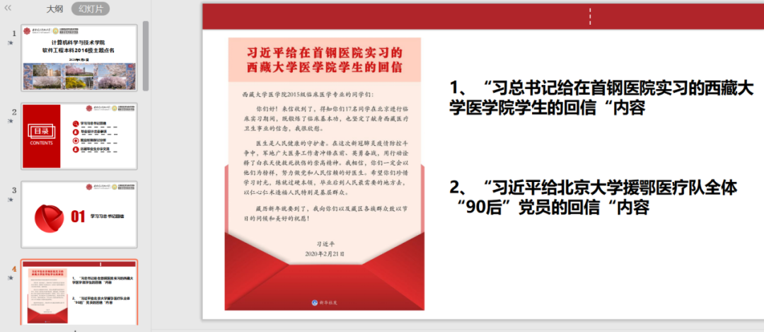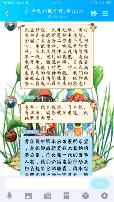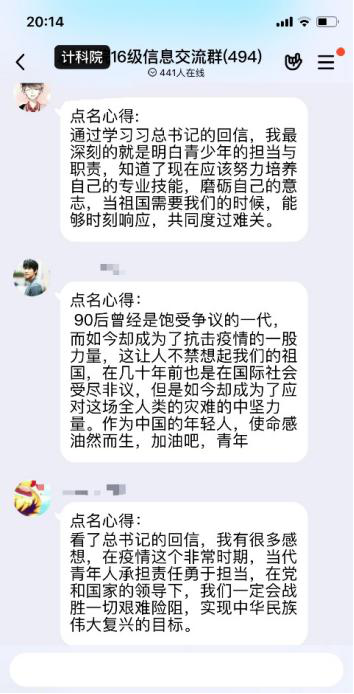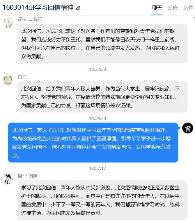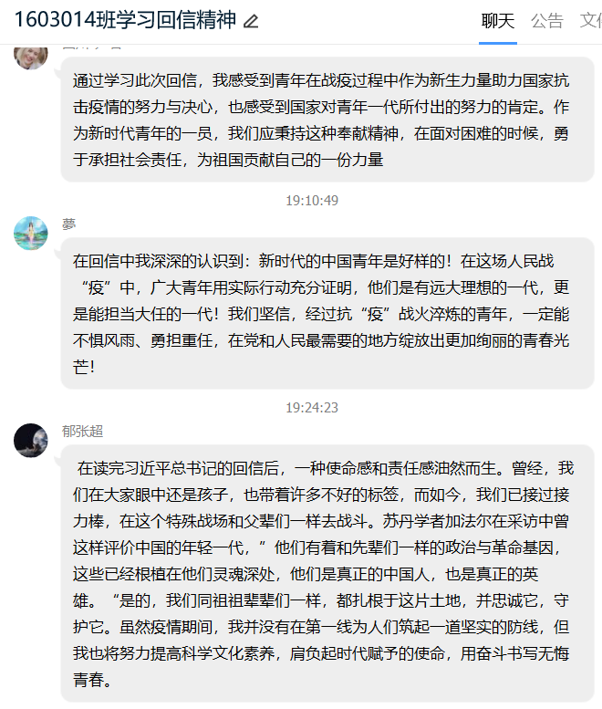 主题点名之后同学们感触良多,本科2017级员工在点名之后纷纷就总书记回信内容撰写心得体会,表达对西藏大学医公司员工以及援鄂医疗队的敬佩之情。本科2016级员工在班群、年级群中就总书记回信内容、就业择业问题开展了积极的讨论,同学们踊跃发言,气氛热烈,纷纷表达自身所思所悟,坚定了为祖国贡献力量的决心。
