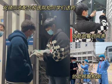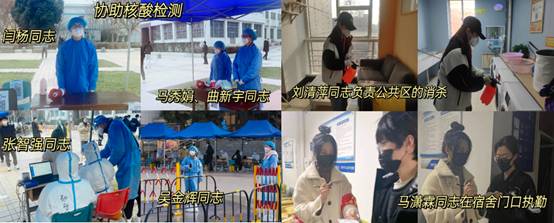张智强同志是支部新发展的党员,也第一时间报名参加了志愿服务,协助医护人员在核酸检测时引导同学们扫码,他说:“穿上防护服的时候我才真正感受到了防疫人员的辛苦,旁边的医生手都冻的发抖,还要一直涂抹酒精,我只能尽一点绵薄之力。虽然刚成为预备党员,但是我要用实际行动践行初心,对得起自己的党员身份。”此外,刘清萍同志在海棠七号书院加入了卫生防护组,承担起了宿舍楼内卫生检查、公共区域消杀等工作;马潇霖同志担任了宿舍所在层的层长,为同学们发布信息、发放物资,监督同学们错峰就餐;马泽帅同志在书院的志愿活动中主动帮助高层的同学搬重物、分发物资……