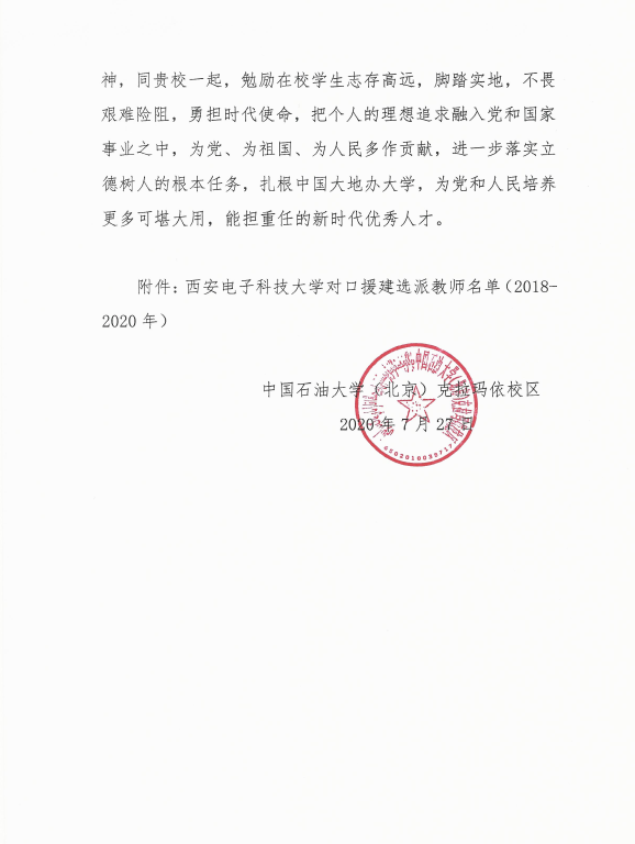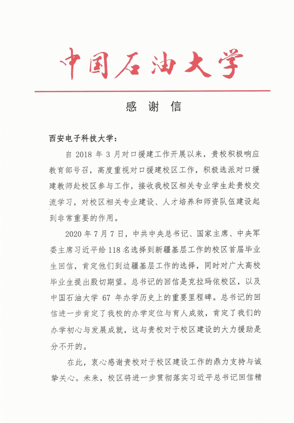 (通讯员 陈龙)为响应教育部号召,对口援建中国石油大学(北京)克拉玛依分校,2018年9月,sunbet选派教学科研经验丰富的牛海军教授前往中国石油大学(北京)克拉玛依分校援建三年,牛海军教授勇于担当、甘于奉献,在援建期间,工作兢兢业业、任劳任怨、无私奉献,开展了大量卓有成效的工作,得到了公司领导、同事和员工们的认可。中国石油大学(北京)克拉玛依分校为表达感谢,专门致电公司,对公司及牛海军教授表示感谢。