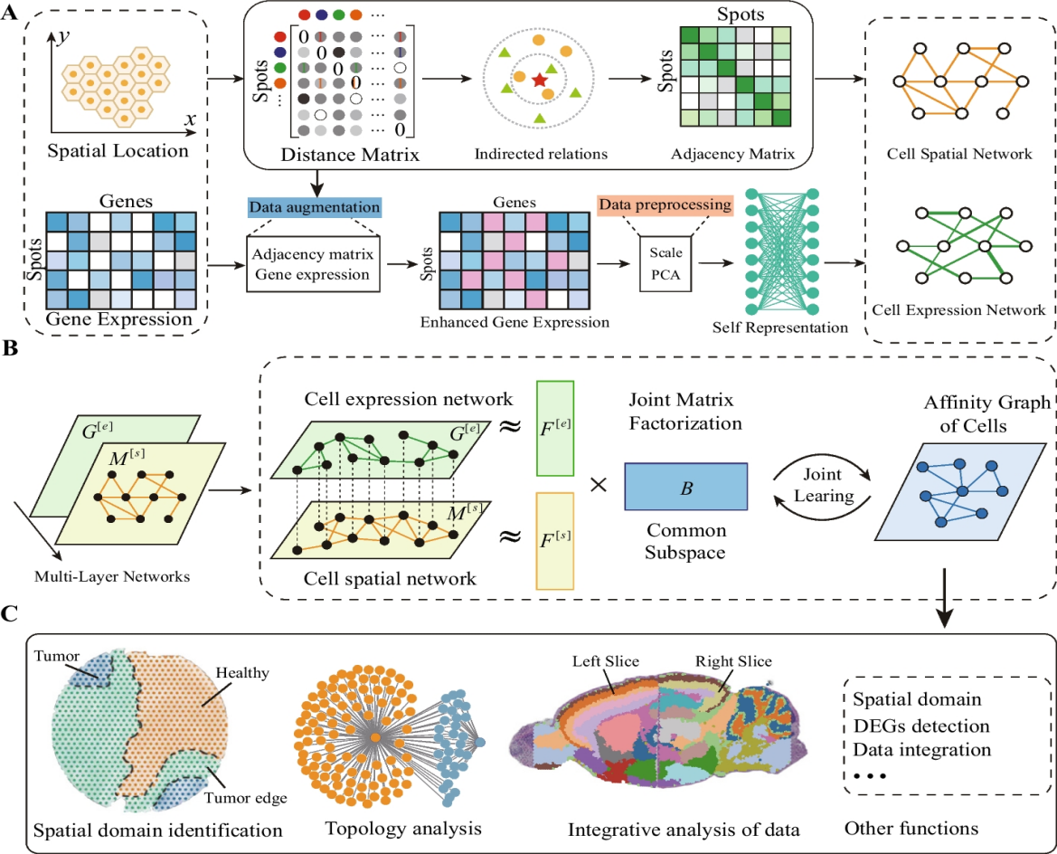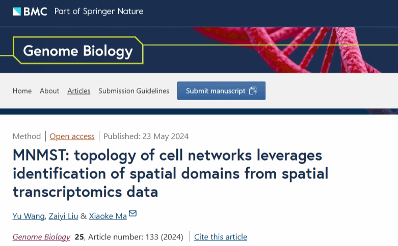 近日,sunbet陕西省智能人机交互与可穿戴技术重点实验室、智能媒体与数据工程研究所马小科教授团队在基因组学顶级期刊《Genome Biology》(五年IF=17.4)发表研究成果“MNMST: topology of cell networks leverages identification of spatial domains from spatial transcriptomics data”,第一作者为sunbet二年级博士生王昱,唯一通讯作者为马小科教授,合作者为广东省人民医院刘再毅主任医师。
