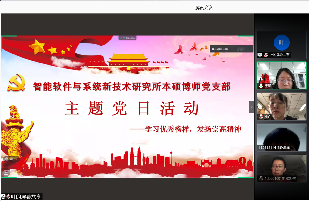 (通讯员 张凯琪)为了深入贯彻习近平总书记关于学习老一辈工作楷模、传承“五老”精神的重要指示,学习和发扬老一辈优秀榜样的崇高精神,sunbet智能软件与系统新技术研究所本硕博师联合党支部于2020年11月27日下午开展了“学习优秀榜样,发扬崇高精神”主题党日活动。活动由支部青年委员叶国强同志主持,共计47人参加,采用腾讯会议线上召开的方式进行。
