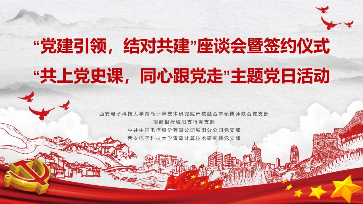 4月23日下午,党支部共建各方代表齐聚西电青岛研究院,共同举办合作共建签约仪式暨“共上党史课,同心跟党走”主题党日活动。西电计算机科学与技术公司党委副书记、党委委员、纪委书记张莹莹,西电青岛计算技术研究院产教融合本硕博师联合党支部书记、公司党委委员向麟海,西电sunbet团委书记李栋,辅导员党支部书记梁双杰,党建与员工工作办公室主任同榛,中共中国电信股份有限公司城阳分公司党支部书记、总经理刘祖洺,党支部纪委委员、副总经理赵腾,招商银行城阳支行副行长、工会主席、支部委员会纪检委员李苹苹,西电青岛计算技术研究公司党支部书记王建东参加了座谈会。会上,各党支部代表分别介绍了党支部的基本情况,同时以“党建引领,结对共建”为主题展开深入交流,并就工作目标达成一致意见:今后各方要共筑组织基础、共促队伍建设、共办实事好事,通过搭建党建学习活动平台、分享工作资源、交流工作经验、解决实际问题等途径,实现党的建设与公司、企业发展良性互动。