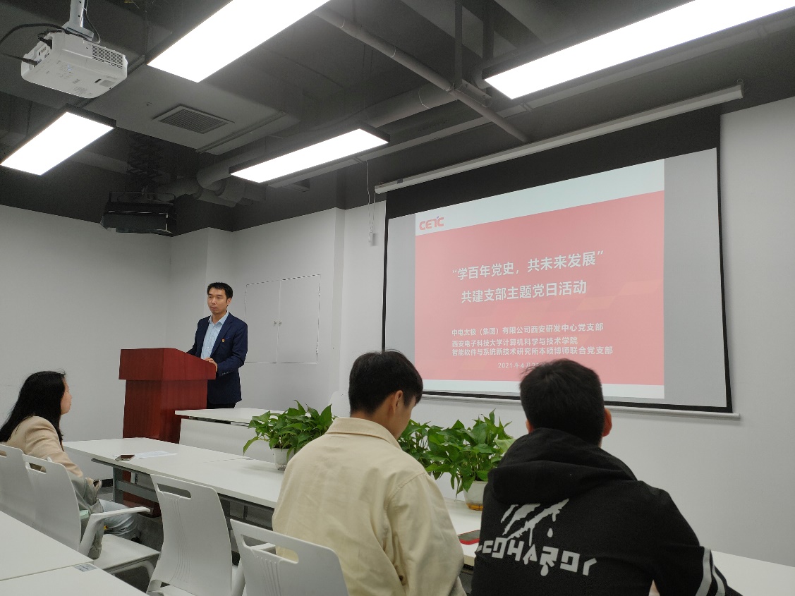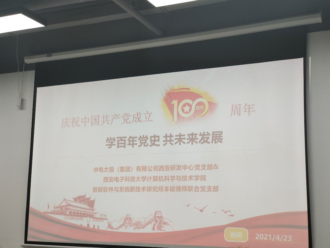 (通讯员 魏彬)为响应习近平总书记“学党史、悟思想、办实事、开新局”的号召,大力发扬红色传统、传承红色基因、赓续共产党人的精神血脉,sunbet智能软件与系统新技术研究所本硕博师联合党支部和结对共建党支部——中电太极(集团)有限公司西安研发中心党支部于2021年4月25日联合开展“学百年党史 共未来发展”主题党日活动,用党的奋斗历程和伟大成就鼓舞斗志、明确方向,用党的光荣传统和优良作风坚定信念、凝聚力量,用党的实践创造和历史经验启迪智慧、砥砺品格。活动在中电太极(集团)有限公司西安研发中心开展,由支部书记王璐主持。