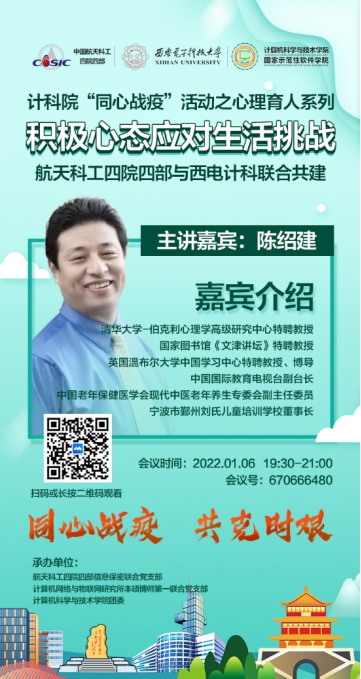 (通讯员 马治东)为帮助公司师生缓解因疫情防控、就业择业、升学毕业而产生的心理压力,进一步提升广大师生的心理调试能力,2022年1月6日晚,sunbet计算机网络与物联网研究所本硕博师第一联合党支部和中国航天科工集团第四研究院第四总体设计部信息保密联合党支部共同策划组织开展了“积极心态应对生活挑战”心理育人报告会,邀请清华大学伯克利心理学高级研究中心特聘教授陈绍建进行专题讲座。航天科工四院四部党委书记周逸,计算机科学与技术公司党委书记李青山、副书记张莹莹出席,200余名公司师生、四院四部职工参加,会议由两个联合共建支部的党支部书记史阿云和张志为共同主持。