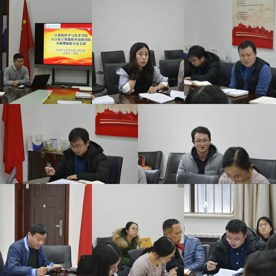 教职工支部的6位支部书记主要从常规学习、主题活动、党员发展等方面全面回顾了2018年下半年支部工作情况,对照工作实际提出了不足和差距,并给出了2019年支部工作的具体内容、路线图和时间表。其中,软件工程系支部书记宋胜利同志从学习重要讲话、贯彻党委要求、基层组织建设、三会一课学习、主题党日活动、党建业务融合等六个方面详细介绍了支部党建工作,并以党支部担负的职责为切入点,将2019年支部工作概括为党员工作和师生工作两个模块,并做详细说明。计算机工程系支部书记鱼亮同志以“抓好党建促教学”思想为指导,重点介绍了支部开展的主题党日活动。网络工程系支部副书记谢琨同志从支部学习、参观帮扶、校企交流、课程思政等方面回顾了支部工作进程。计算机科学系支部书记戚玉涛同志、实践教学中心支部书记杨力同志均谈到了需进一步突出特色、创新形式、增强支部活动吸引力。机关支部书记赵韩强同志从机关的服务职能入手,着重对支部开展的党风廉政建设专题学习进行了汇报。