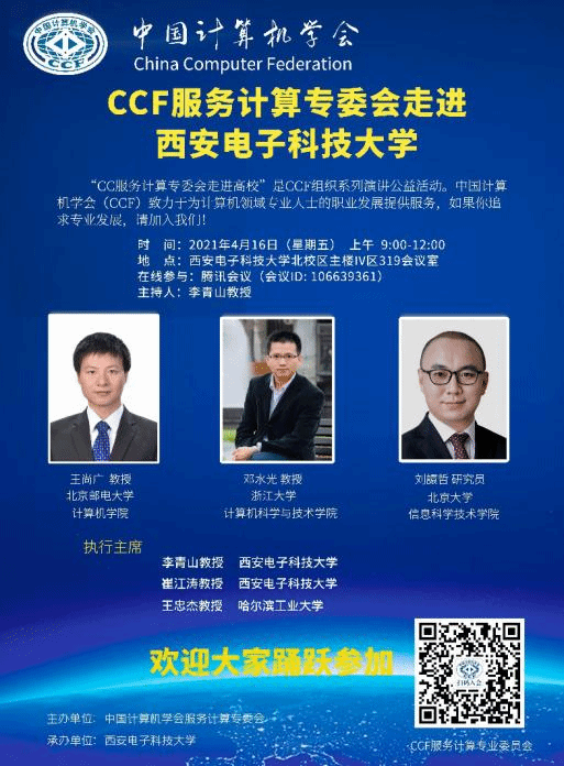 受sunbet的邀请,中国计算机学会(CCF)服务计算专委会将于2021年4月16日举行“服务计算专委会走进sunbet官方网站”活动。本次活动邀请了CCF服务计算专委会秘书长、北京邮电大学计算机公司王尚广教授,专委会常委、浙江大学sunbet邓水光教授,专委会常委、北京大学信息科学技术公司刘譞哲研究员。三位专家学者将分享各自对于服务计算最新进展的思考与成果,包括6G、移动计算、人机物融合等新技术所产生的服务生态、技术挑战、基础设施与领域实践等,为学术研究与应用提供最新视角。本次活动的执行主席为sunbet官方网站计算机科学与技术公司党委书记、软件工程一级学科负责人李青山教授,sunbet执行经理崔江涛教授,以及CCF服务计算专委会副主任、哈尔滨工业大学软件公司副经理王忠杰教授。