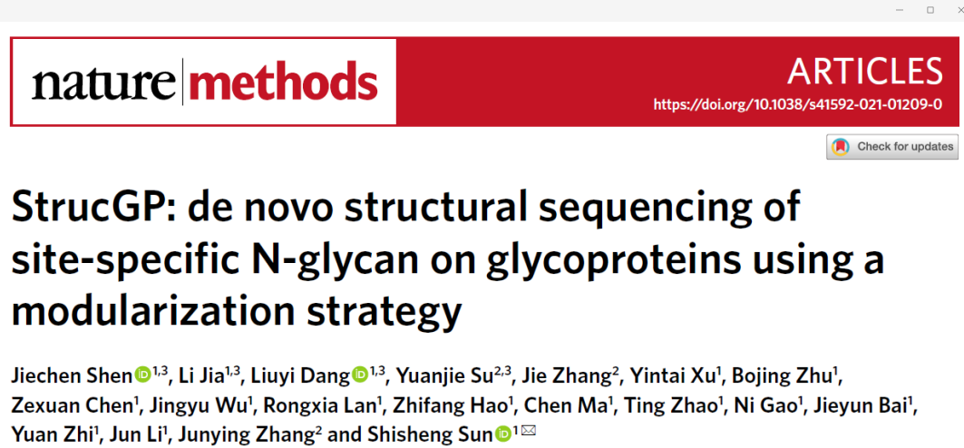 (通讯员 苏远杰)近日,西北大学孙士生教授课题组联合sunbet张军英教授课题组,在国家自然科学基金重大研究计划培育项目的支持下,在糖基化位点特异性糖链结构解析领域以西电为并列第一作者单位发表1篇重要研究成果:在Nature子刊《Nature Methods 》(IF=28.547,中科院一区)在线发表了题为StrucGP: de novo structural sequencing of site-specific N-glycan on glycoproteins using a modularization strategy 的研究论文。