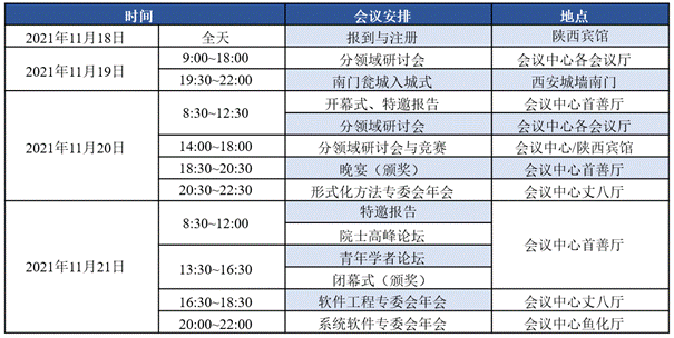 2021CCF中国软件大会将组织特邀报告、院士高峰论坛、青年学者论坛、论文专刊论坛、顶会顶刊论坛、学术论坛、工业论坛、教育论坛、学科竞赛答辩和软件研究成果展示等30余个不同类型的活动。大会将邀请10余位软件及相关领域中国科公司院士与中国工程院院士,为大会带来特邀报告并参加院士高峰论坛等活动。目前已邀请参会的两院院士包括中国科公司院士林惠民,中国科公司院士陶文铨,中国科公司院士梅宏,中国科公司院士吕建,中国科公司院士李应红,中国工程院院士廖湘科,中国科公司院士杨孟飞,中国科公司院士管晓宏,中国科公司院士王怀民,中国科公司院士冯登国,中国工程院院士孙凝晖等。