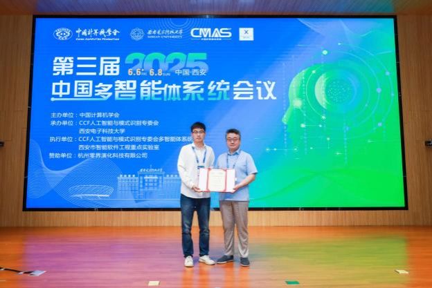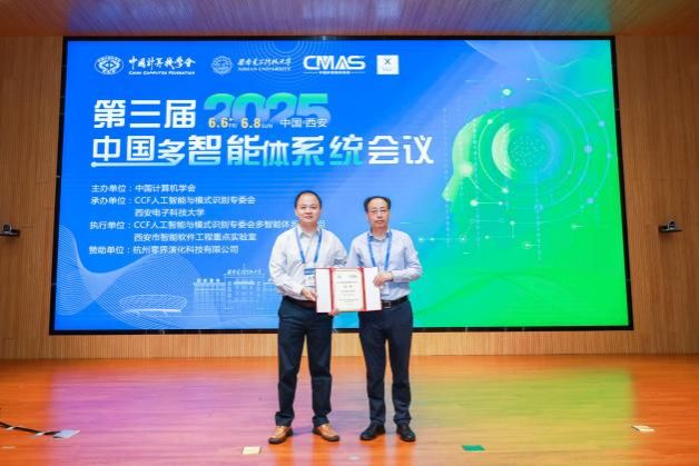 最后颁发中国智能体与多智能体系统优秀博士论文提名奖(2025),获奖人员包括北京大学陈昱蓉博士、中国科公司自动化所徐志伟博士、上海科技大学张尧博士、香港城市大学周厚宇博士。