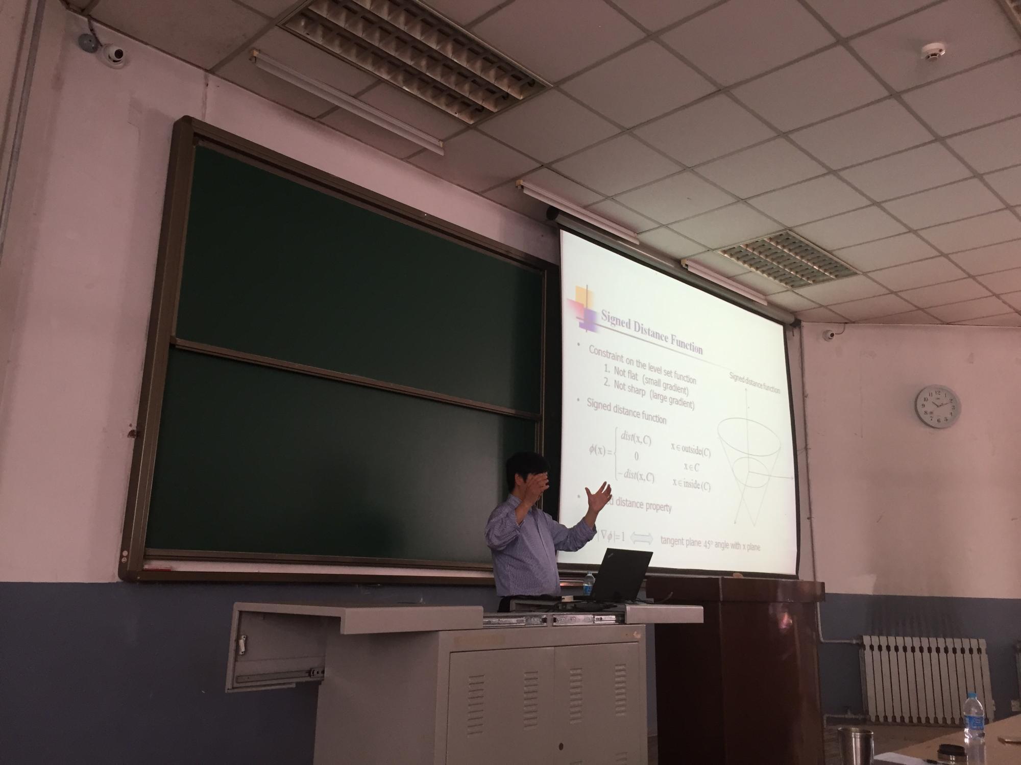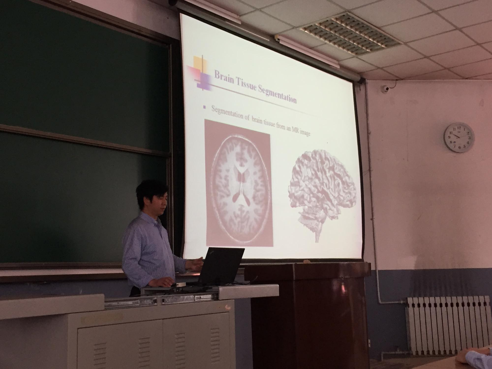 在报告 中,李纯明首先介绍了距离正则化水平集方法及其在图像分割中的应用,之后李教授分析了能够分割具有灰度不均匀性图像的水平集方法,此后又描述了能够同时分割和校正灰度不均匀性的能量极小化模型,最后介绍了基于多图谱和解剖学几何性质的大脑和心脏分割模型。李教授生动描述了水平集方法中数学公式下隐藏的物理含义,并通过视频演示解释了水平集方法的演化迭代过程。 李老师的精彩讲座,赢得了各位老师和同学的阵阵掌声,大家纷纷表示,讲座使大家开阔了视野,受益匪浅。