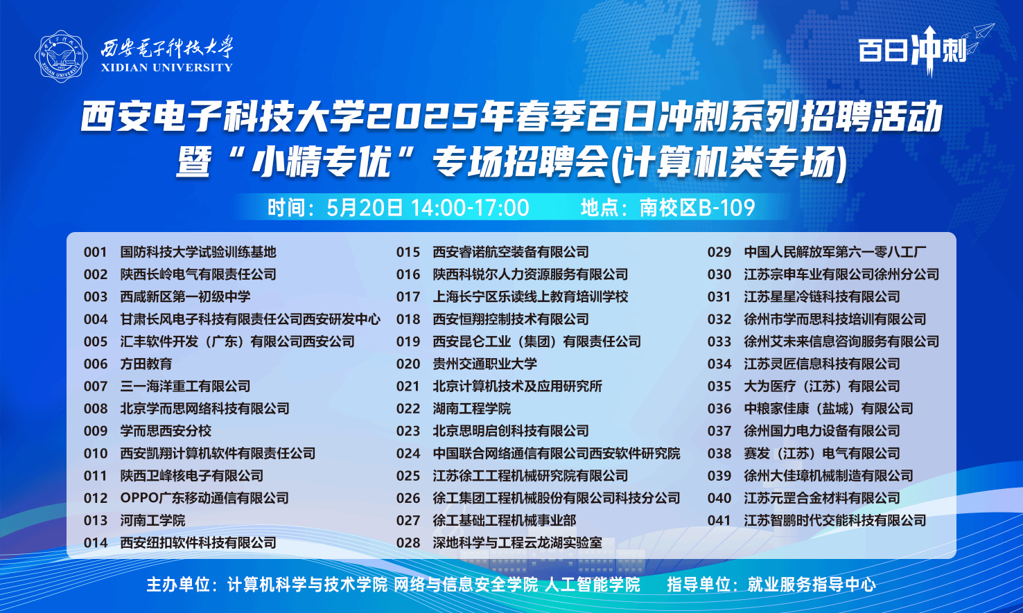 (通讯员 奚晶瑾)为落实教育部春季促就业攻坚行动,促进计算机大类毕业生高质量充分就业,5月20日下午,sunbet官方网站2025年春季百日冲刺系列招聘活动暨“小精专优”专场招聘会(计算机类专场)在南校区B教学楼109教室举办。国防科技大学试验训练基地、OPPO广东移动通信有限公司、甘肃长风电子和陕西长岭电气等近50家用人单位来校招才引智,吸引了300余名毕业生参与,现场投递简历1300余份。本次双选会在就业指导服务中心指导下,由sunbet、网络与信息安全公司、人工智能公司联合主办。