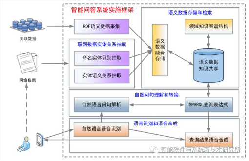 针对复杂自然语言文本信息抽取提出了多阶语义关系抽取方法,基于分布式知识图谱构建了知识抽取、知识融合和知识演化模型,研发了面向自然语言交互的智能问答系统。系统实现了联网数据实体关系抽取、语义数据存储与检索等关键技术,核心模块包括:①联网数据实体关系抽取模块;②语义数据存储和检索模块;③语音识别和语音合成模块;④自然问句理解和转换模块。