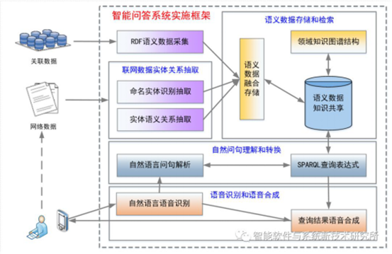 针对复杂自然语言文本信息抽取提出了多阶语义关系抽取方法,基于分布式知识图谱构建了知识抽取、知识融合和知识演化模型,研发了面向自然语言交互的智能问答系统。系统实现了联网数据实体关系抽取、语义数据存储与检索等关键技术,核心模块包括:①联网数据实体关系抽取模块;②语义数据存储和检索模块;③语音识别和语音合成模块;④自然问句理解和转换模块。